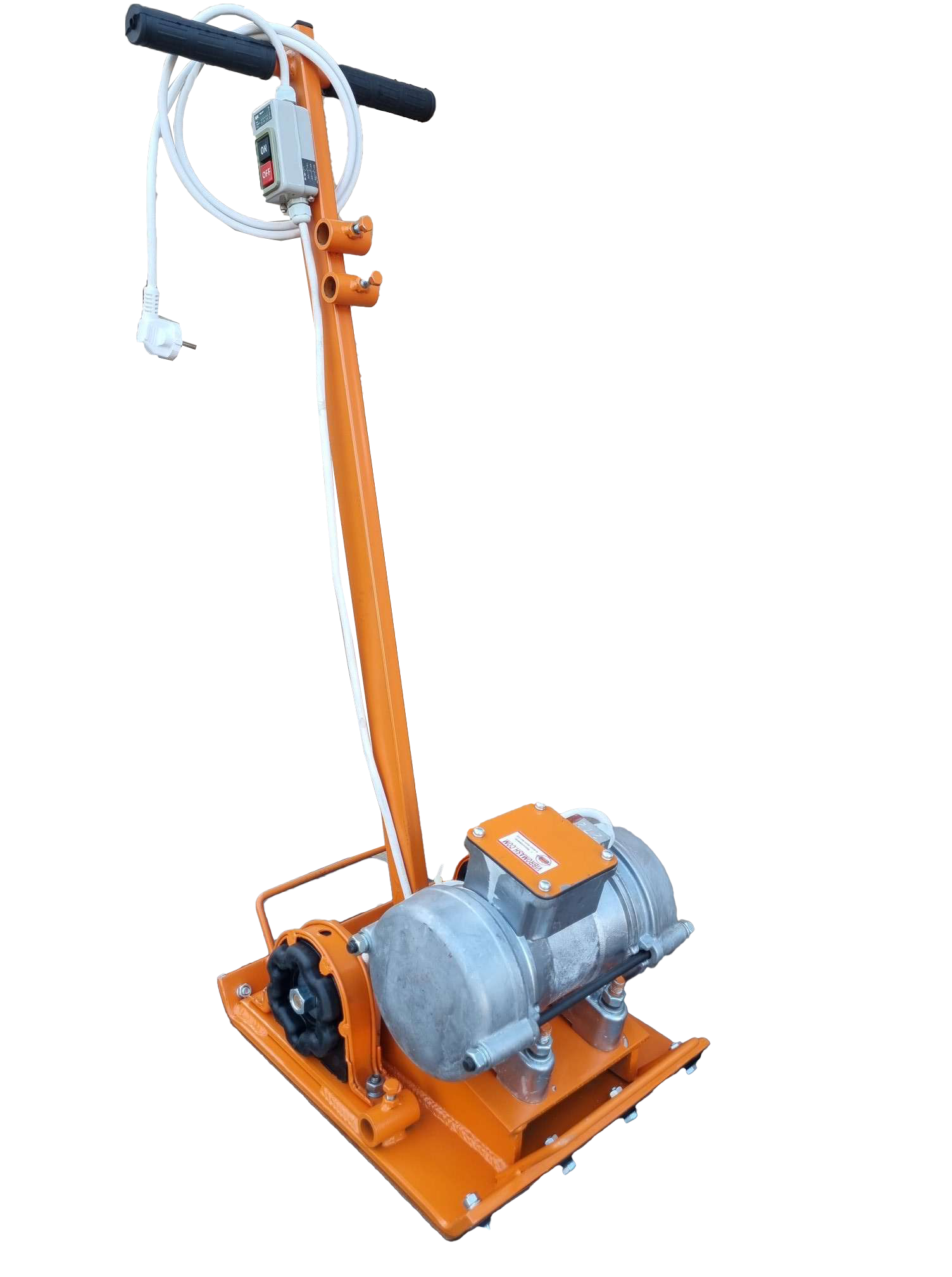 Виброплита представляет собой конструкцию из плиты, являющейся его рабочей частью, в центре которой установлен электромеханический вибратор общего назначения с круговыми колебаниями ВИ-99В, который представляет собой трехфазный асинхронный электродвигатель с короткозамкнутым ротором с установленными на концах вала ротора дебалансами. Дебалансы, вращаясь с валом ротора, создают вынуждающую силу. К плите через специальные виброизоляторы прикреплена рама с рукояткой управления. На рукоятке установлен выключатель электропитания вибратора. Уплотнение происходит за счет вертикальной составляющей вынуждающей силы, возникающей в вибраторе. Поступательное движение виброуплотнителя происходит за счет горизонтальной составляющей вынуждающей силы.