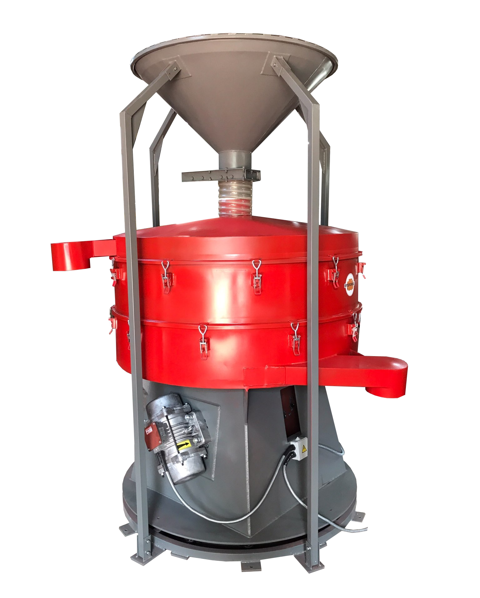 Сыпучая масса равномерно подаётся через верхний центральный патрубок с помощью питающего устройства (шлюзовой или шнековый питатель, цепной конвейер, дозатор и т.д.) в сито. Последовательно проходя через несколько сит с разными размерами ячеек, исходный продукт разделяется на фракции благодаря колебаниям вибрационной рамы. Частицы размером меньше ячейки сита – проходят сквозь него, а более крупные – задерживаются на сетке и под воздействием колебаний отводятся через боковой патрубок. В одном вибросепараторе может быть установлено от 1 до 3-х дек (сит), что обеспечивает разделение материала от 2 до 4 фракций.