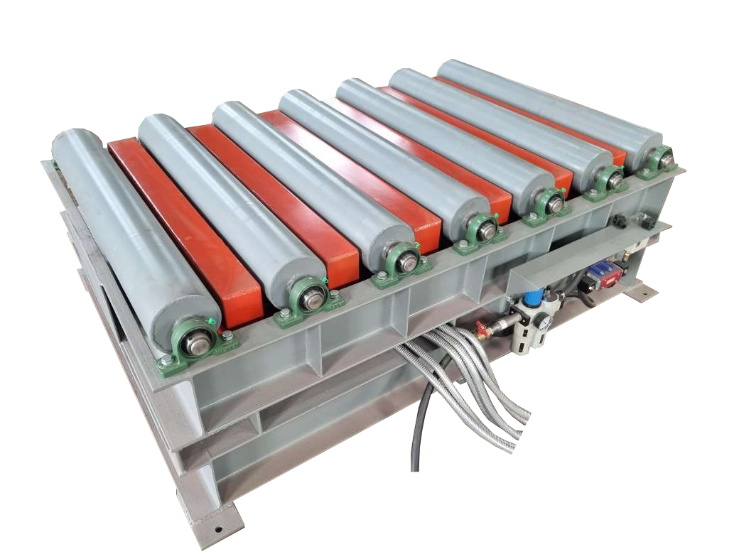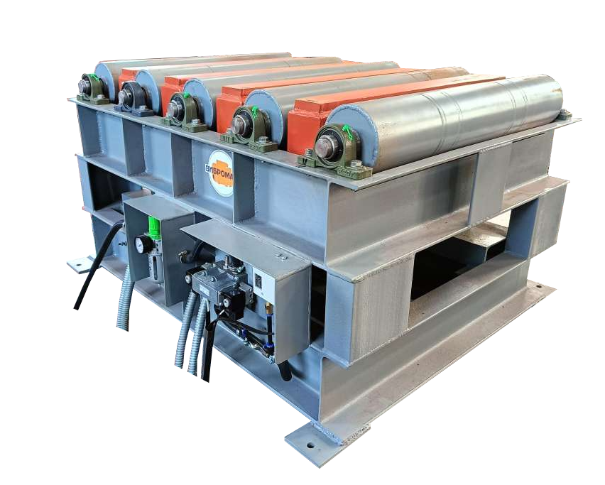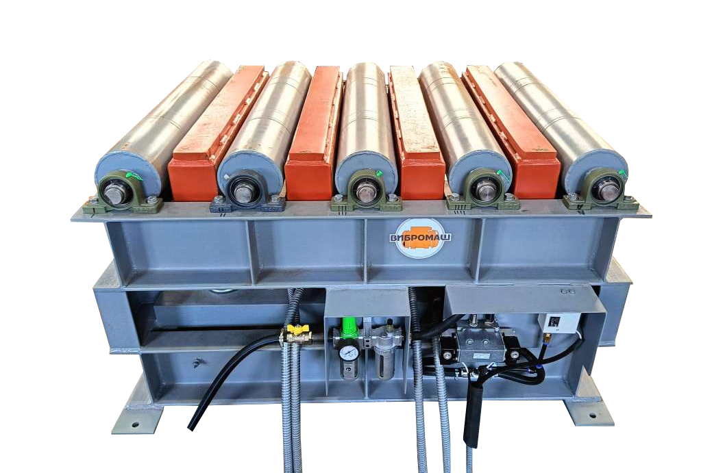 Подъем вибростола осуществляется пневматическими опорами. В опоры подводится сжатый воздух. При отсутствии давления в рукавах уровень плоскости стола находится ниже уровня плоскости роликов рольганга. При подаче давления рукава, наполняясь воздухом, поднимают стол выше роликов и выполняют роль амортизаторов, предотвращая передачу вибрации на основание.
